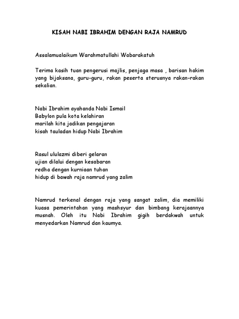 Teks Bercerita Mtq 2011 Nabi Ibrahim Dan Raja Namrud from imgv2-2-f.scribdassets.com Tetapi fakta tersebut cenderung umum. Raja namrud merupakan penguasa babilonia yang sombong dan banyak dari kaumnnya yang mempercayai bahwa raja namrud adalah tuhan. Kisah keangkuhan raja namrud 1. Namun sayangnya, namrud adalah raja yang dzalim, ia tak serta merta membunuh rakyatnya yang tidak mematuhinya. Raja namrud telah dianugerahkan daya intelek yang tinggi dan menjadi pakar dalam pelbagai bidang seperti seni reka, matematik dan ilmu falak. Qarun dengki dan iri kepada musa atas kenabiannya. Kisah mengenai dakwah nabi ibrahim as kepada raja namrud yang mengaku tuhan, oleh ustadz dr khalid basalamah, ma. Raja namrud, demikian nama dari seorang raja yang sombong ini.