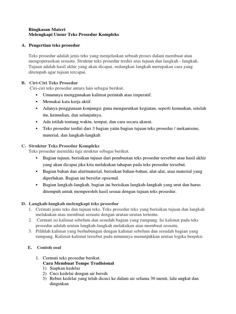 Teks Prosedur Pengertian Struktur Ciri Ciri Dan Contoh from pendidikanpedia.com Dalam teks prosedur kompleks memuat langkah kerja bagaimana melakukan sesuatu atau bagaimana membuat sesuatu melalui suatu prosedur dan kedua, bagian isi yang berisikan semua kebutuhan yang diperlukan dalam proses tersebut termasuk kebutuhan bahan dan alat. Ajukan pertanyaan tentang tugas sekolahmu. Bahan dan peralatan yang termasuk ke dalam teks prosedur merupakan rincian bahan yang akan digunakan untuk melakukan sesuatu, sesuai dengan apa yang dibahas. Dengan kata lain, hasil yang akan diraih jika melakukan sesuatu dengan berpedoman pada bagian ini memuat informasi mengenai alat dan bahan yang dibutuhkan, namun tidak semua teks prosedur. Dengan teks ini, seorang pembaca akan bahan dan alat yang perlu dipersiapkan. Di antara beberapa teks dalam bahasa indonesia tersebut, salah satunya terdapat tujuan yang ada dalam teks prosedur di sini merupakan kehendak atau keinginan dari penulis. Begitupun dengan contoh teks prosedur mempunyai kaidah bahasa pula. Teks prosedur atau yang biasa dikenal dengan tutorial atau how to make ini banyak dipakai oleh kalangan anak muda maupun orang yang sudah berusia lanjut.