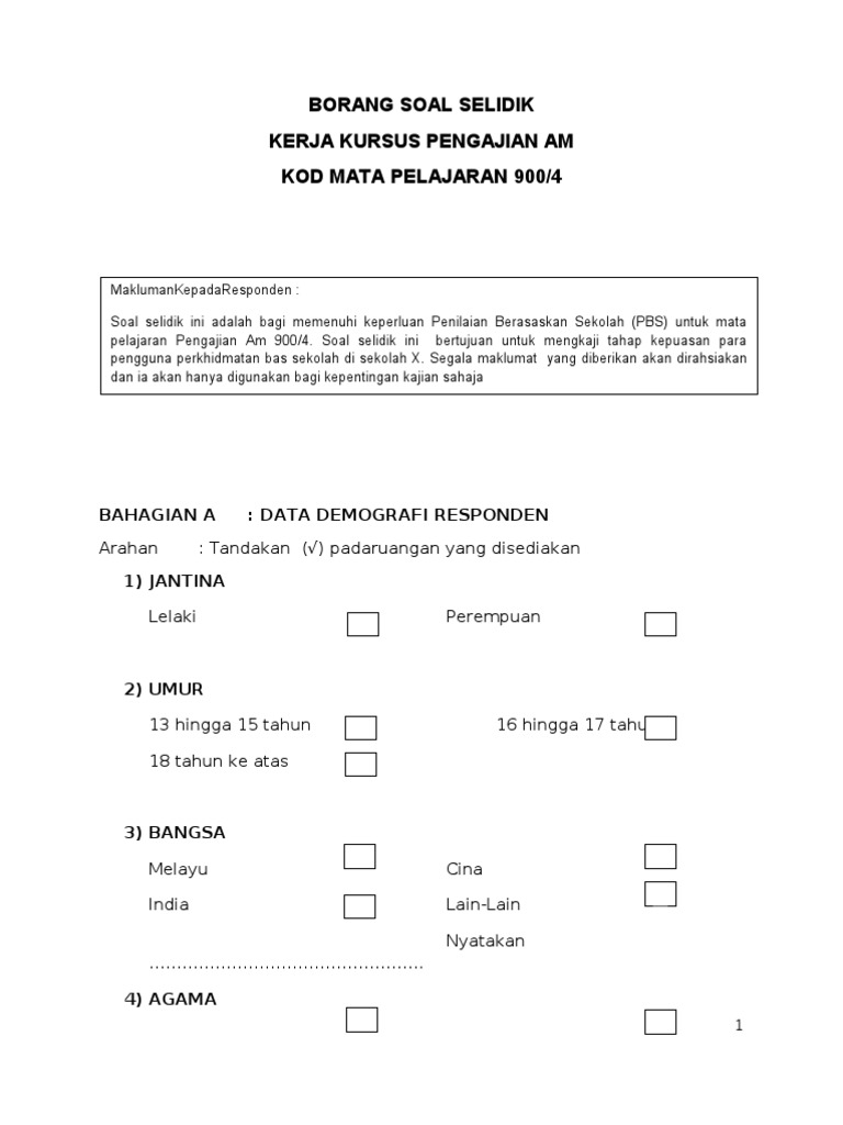 Respon pelajar terhadap pengajaran guru bahagian a: Tajuk kajian 'guna tanah di kawasan kajian anda' telah dipilih sebagai tugasan yang wajib disiapkan oleh setiap calon pt3 pada tahun 2018. ( ) lelaki ( ) perempuan 2) umur report borang soal selidik. Sektor awam sekitar kota kinabalu dengan menggunakan teknik persampelan bertujuan (purposive. Borang kaji atau soal selidik ini perlu dibuat dalam perlaksanaan dan disertakan dalam pelaporan tugasan wajib bagi ujian pelbagai instrumen (geografi) pentaksiran tingkatan 3 (pt3) kajian lapangan atau lebih dikenali sebagai kerja kursus, agar menjelaskan lagi hasil dapatan dan maklumat yang.