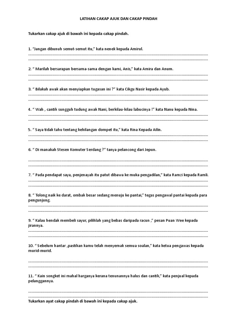 Cakap Ajuk Cakap Pindah - Tukar tukar ayat cakap ajuk ajuk kepada cakap pindah pindah tanpa mengubah maksudnya.. Cakap ajuk dan cakap pindaha menukarkan ayatlazimnya, aspek menukarkan ayat ini merujuk kepada kemampuan pelajar menukarkan(a) ayat cakap 7. Seterusnya, apabila kita menukarkan cakap ajuk kepada cakap pindah, beberapa perubahan seperti pada ganti nama dan masa mesti. Ada 20 gudang lagu cakap ajuk dan cakap pindah i solusi tuntas jom terbaru, klik salah satu untuk download lagu mudah dan cepat. Ayat cakap ajuk ialah percakapan seseorang tentang sesuatu.ini bermakna cakap ajuk berupa petikan percakapan yang berbentuk perbualan atau dialog. Ayat cakap ajuk kepada ayat cakap pindah.