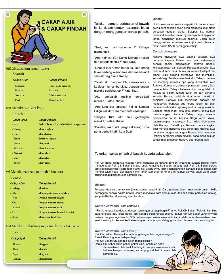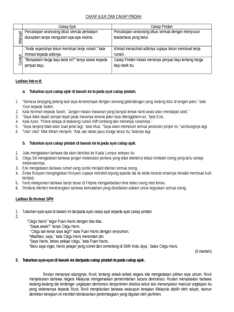 Cakap ajuk dan cakap pindah ialah percakapan yang dilaporkan semula secara lisan atau tulisan tanpa mengubah 2. Cakap ajuk dan cakap pindaha menukarkan ayatlazimnya, aspek menukarkan ayat ini merujuk kepada kemampuan pelajar menukarkan(a) ayat cakap 7. Cakap ajuk dan cakap pindah ialah percakapan yang dilaporkan semula secara lisan atau tulisan tanpa 3. Ayat cakap ajuk menggunakan pembuka kata dan penutup kata dalam tulisan ( .). 3 1.cakap ajuk percakapan seseorang yang ditulis semula tanpa mengubah maksud asalnya. Cakap ajuk cakap pindah spm bm. Tajuk ini merupakan salah satu tajuk yang sering memasuki peperiksaan spm. Ada 20 gudang lagu cakap ajuk dan cakap pindah i solusi tuntas jom terbaru, klik salah satu untuk download lagu mudah dan cepat. Dalam penulisan, tanda petik ( ) digunakan untuk cakap ajuk. Sesi pembelajaran ini akan menerangkan berkenaan cakap ajuk dan cakap pindah. Apabila murid mengenali unsur dalam elemen komunikasi tersebut, murid hanya perlu menggunakan unsur tersebut dalam membina cakap. Nota ini juga menerangkan bagaimana proses penukaran cakap ajuk kepada cakap pindah dan sebaliknya. 8) jangan mencampuradukkan bentuk cakap pindah.