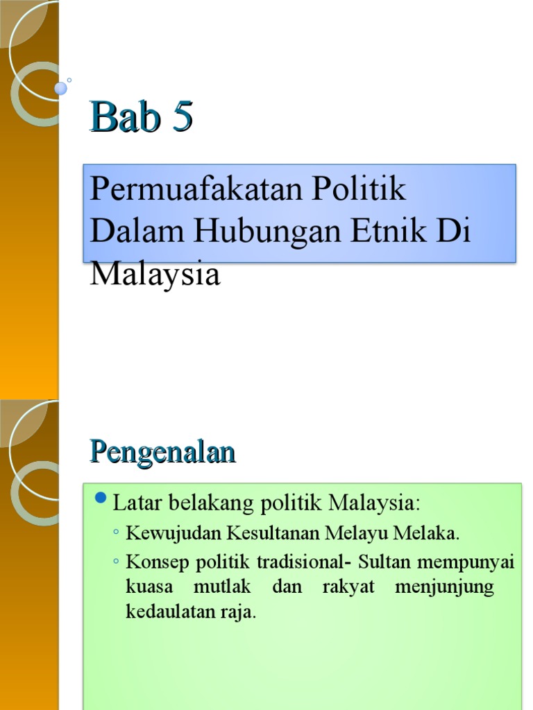 Bab 5 permuafakatan politik dalam konteks hubungan etnik di malaysia selepas mempelajari bab ini, pelajar dapat: Pemuafakatan poltik dalam konteks hubungan etnik di malaysia 01/13/14 dr. Liputan kuliah• pengenalan• konsep modenisasi danpembangunan politik• pelaksanaan modenisasi danpembangunan politik di malaysia• kemajmukan masyarakat dalamproses politik di malaysia• kerjasama politik dan hubunganetnik View bab 5.ppt from hubungan e mpu3113 at university of kuala lumpur. Menghuraikan usaha yang diambil untuk mengukuhkan kesepaduan sosial melalui politik. Mengetahui perkembangan parti politik di1. Permuafakatan politik dalam konteks hubungan etnik di malaysia setelah mengikuti perkuliahan bab ini para pelajar akan memahami latar belakang plural malaysia. 4.pemupukan hubungan etnik secara formal. Sebuah neg ara, dua imagi nasi sosiologikal: 35 keharmonian 36 hubungan etnik selepas penubuhan malaysia kejayaan: Dapat disimpulkan bahawa taburan penduduk di sesuatu kawasan parlimen yang majoritinya terdiri daripada etnik tertentu sebenarnya ditentukan oleh faktor sejarah dan _____. K esepaduan dalam k epelbagaian. 3.kerjasama politik dan hubungan etnik.